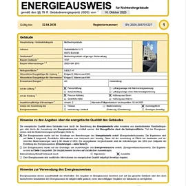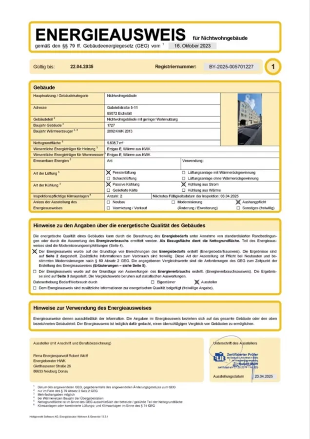 Heizung Erdgas; 250,9 kWh(m²a) ohne Warmwasser (Energieausweis 2023). Die Räume sind auf der Südseite klimatisiert.