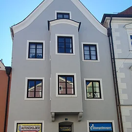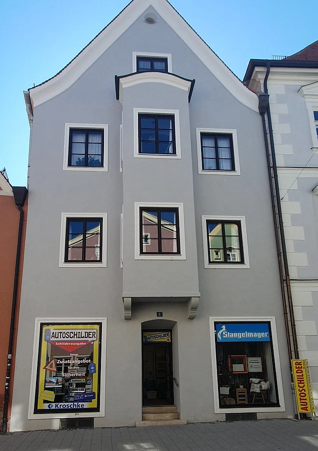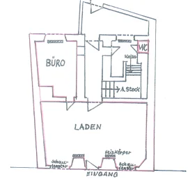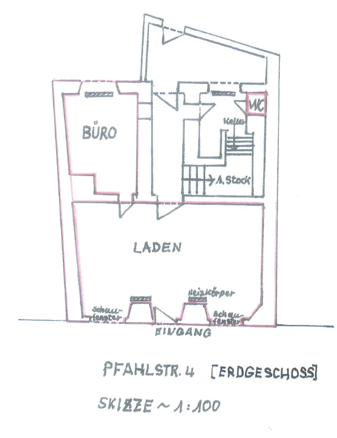 Der Laden ist mit zwei schönen Schaufenstern zur Produktpräsentation ausgestattet und über drei Stufen zugänglich. Im Rückbereich stehen ein Büro oder Lagerrraum sowie ein WC zur Verfügung.